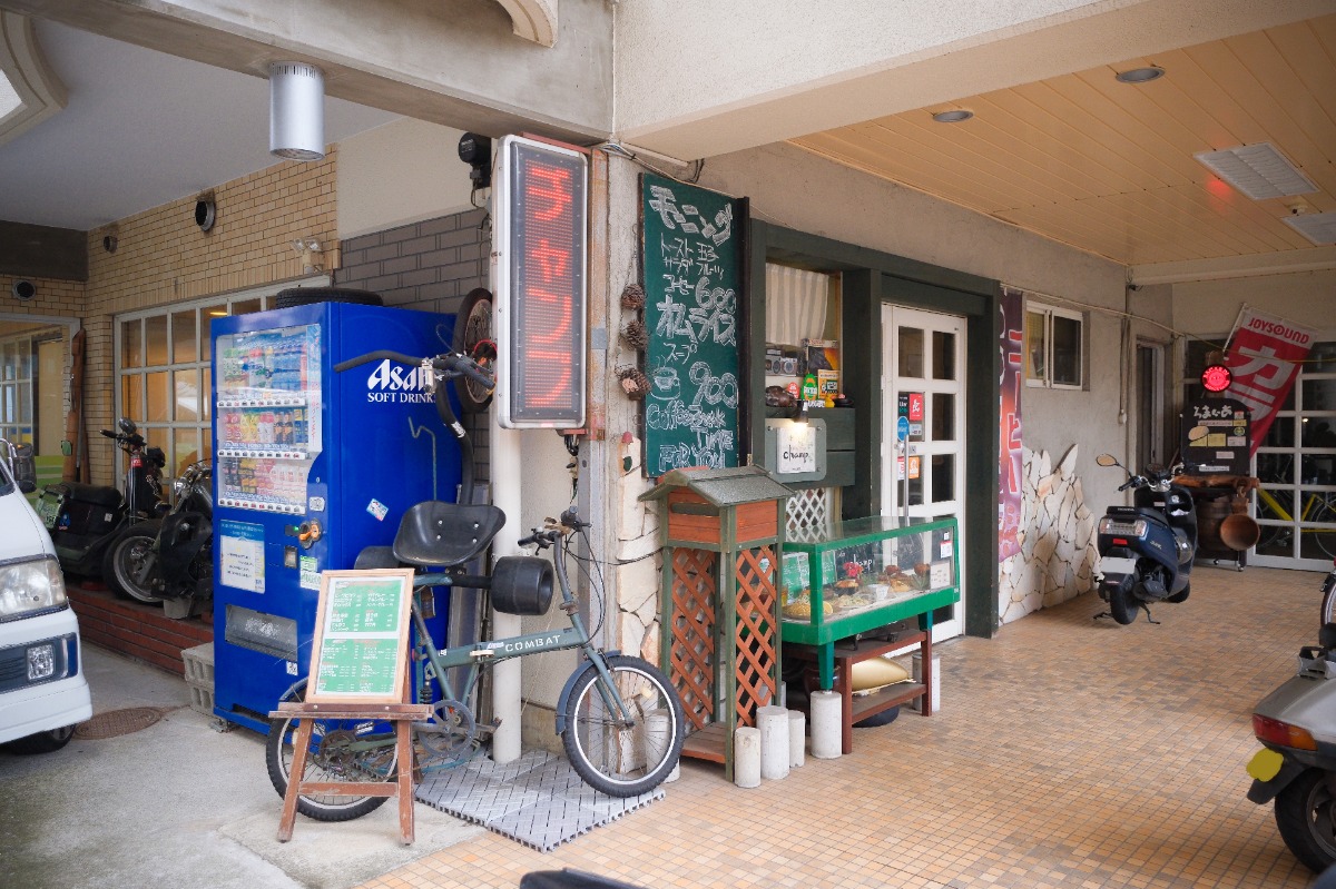 グリーンがかわいいショーケースと看板がお迎えしてくれます。