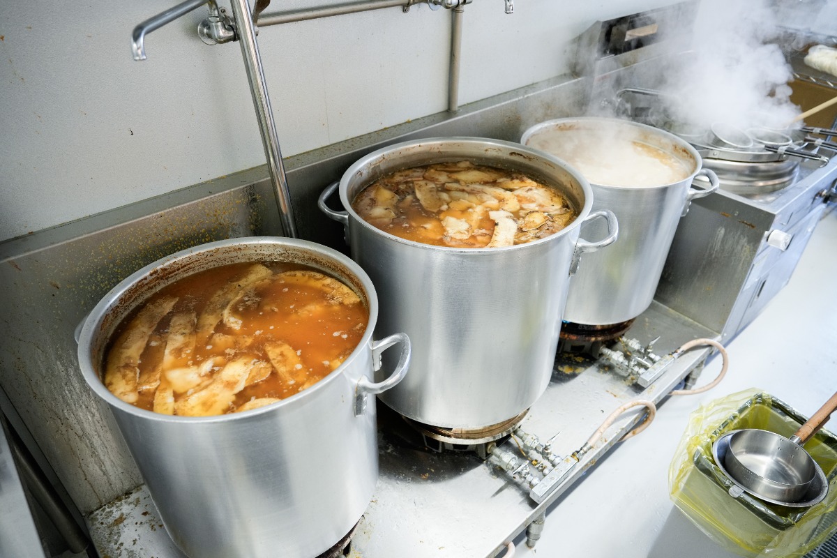 熟成度の異なるスープが入った3つの鍋があり、一番熟成させた鍋のスープが減っても、前日に仕込んだスープを継ぎ足すことで、常に熟成したスープを提供し続けることができます。