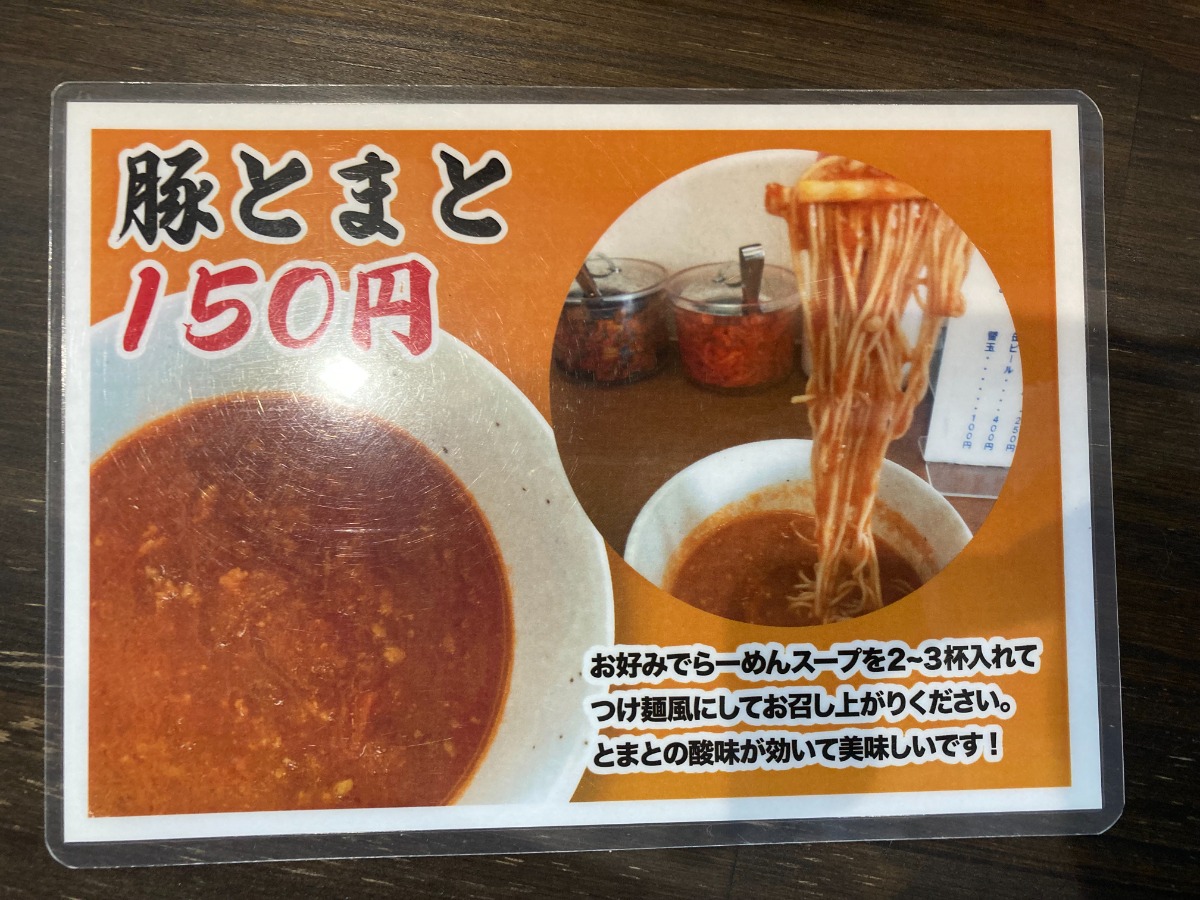 カウンター・テーブル席にあるメニュー表を見ると「豚とまと」という珍しいトッピングがありました!