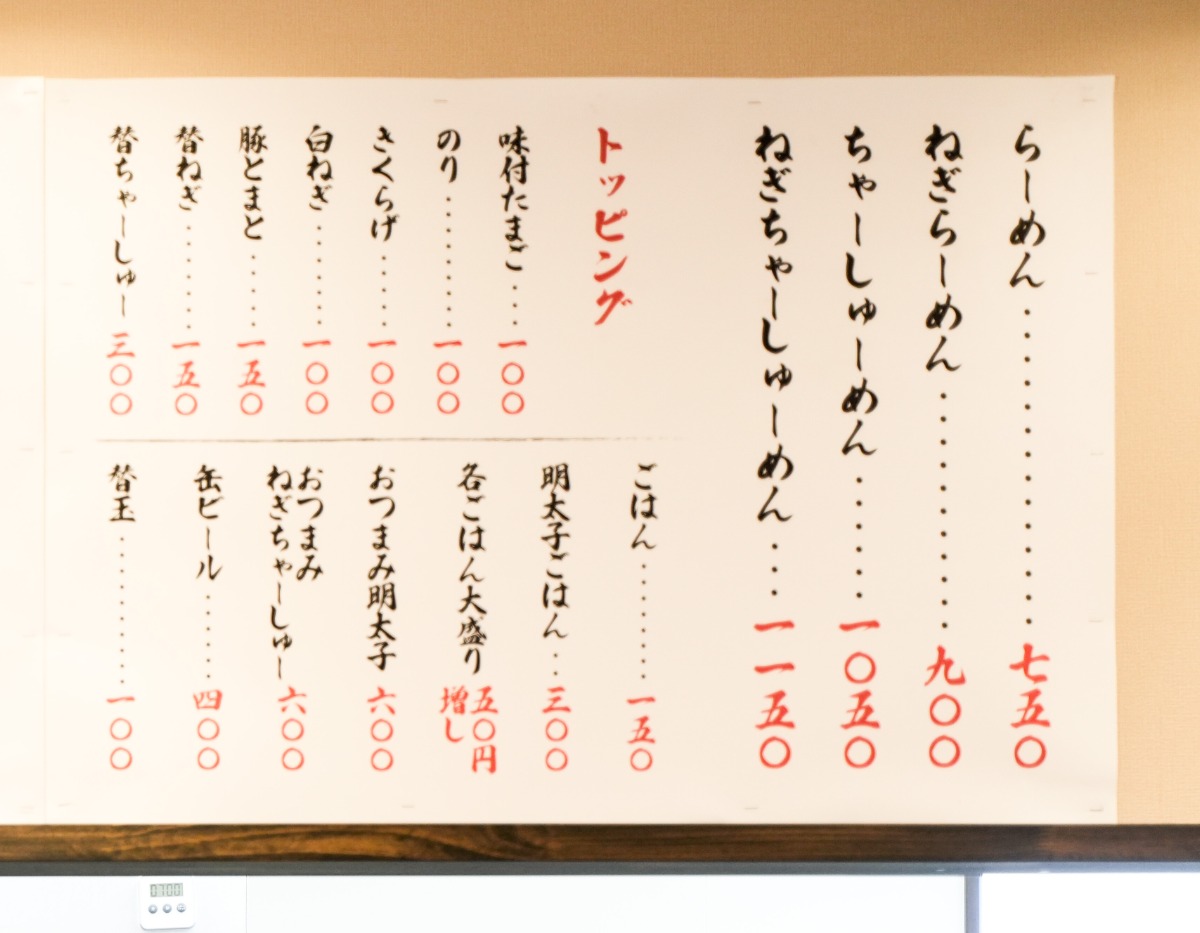 また、ラーメンのメニューは「らーめん」「ねぎらーめん」「ちゃーしゅーめん」「ねぎちゃーしゅーめん」の4種類があります。