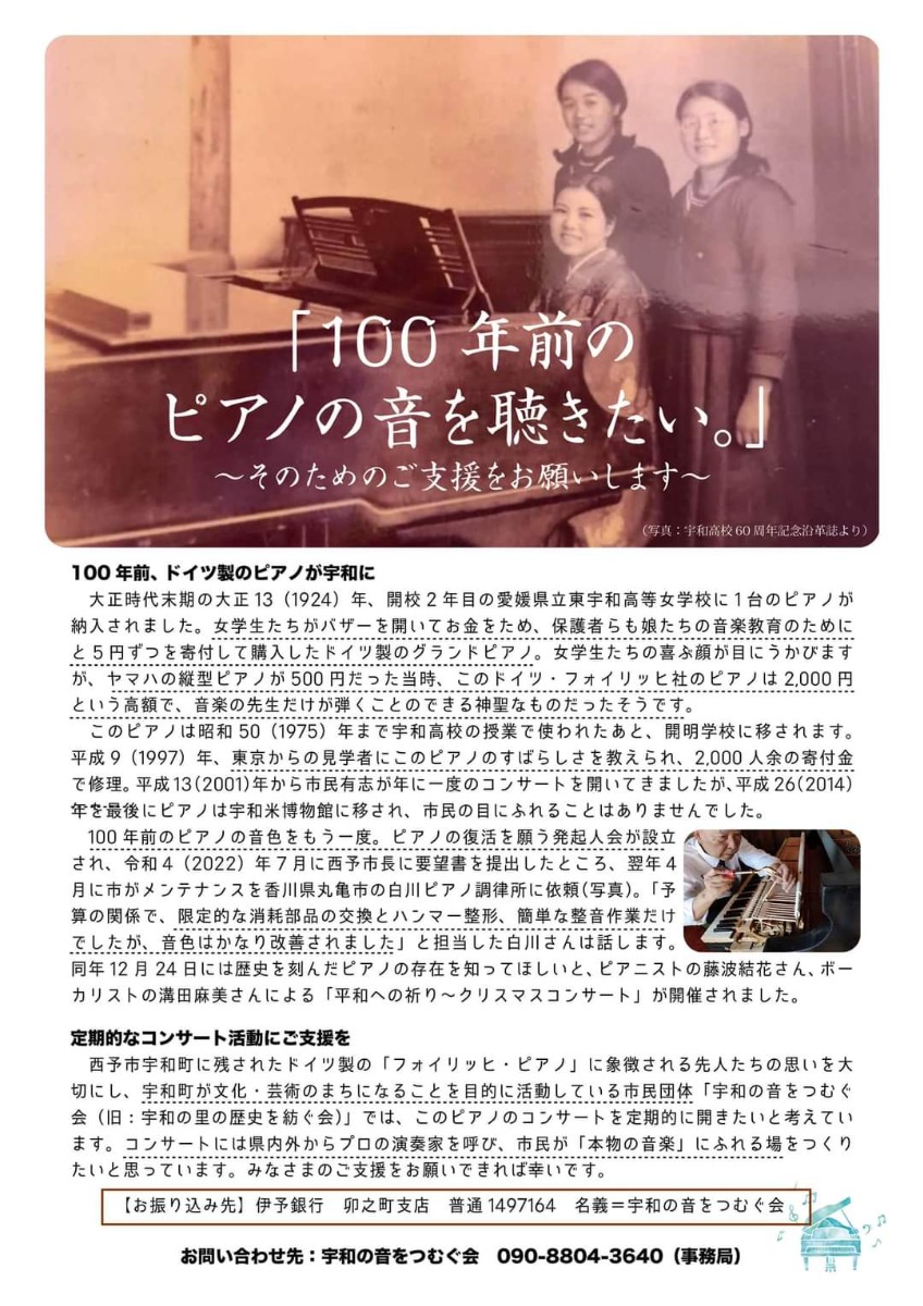 宇和高校ゆかりのドイツ製「フォイリッヒピアノ」で奏でる、100年前の音を聴く―。