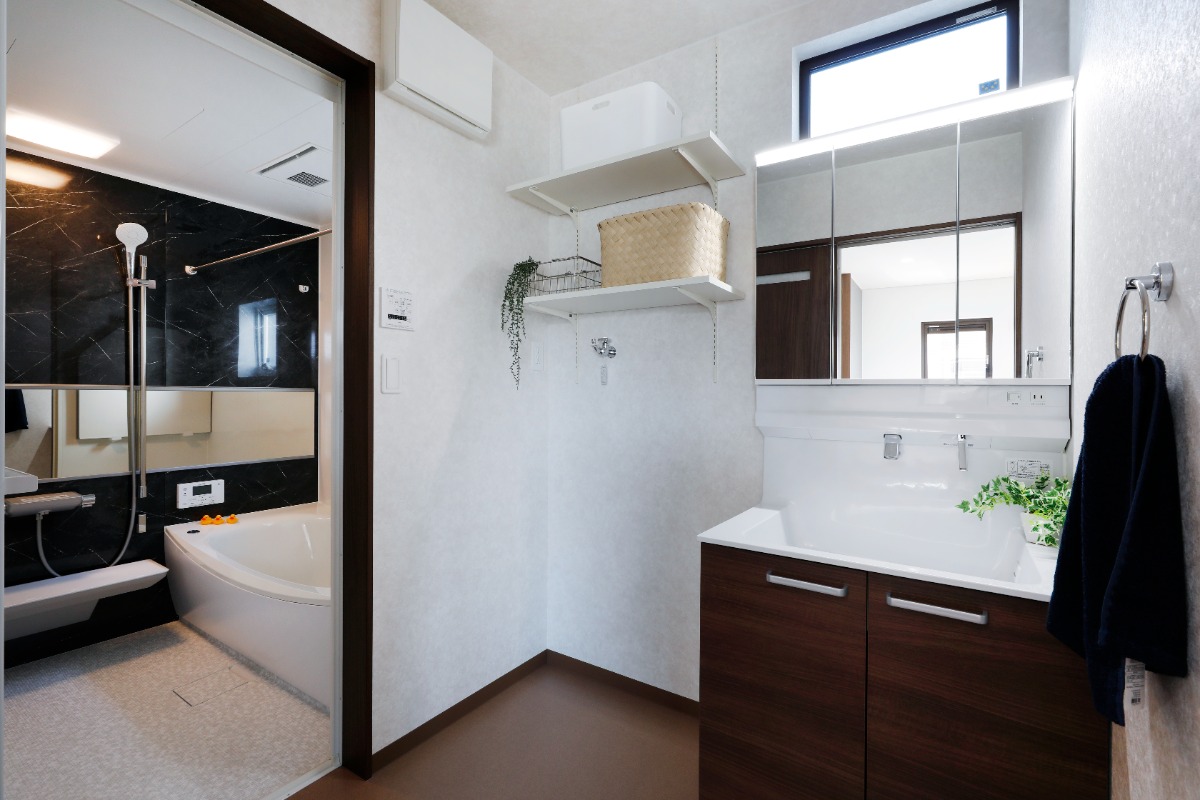 洗面化粧台には三面化粧鏡を採用しており、忙しい朝の快適な身支度を手伝ってくれる。