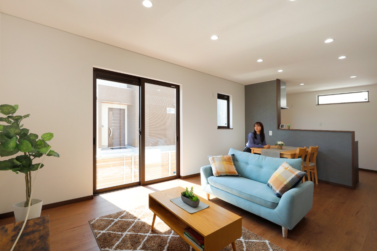分譲地内で陽当たりが良く、あたかかな光が射し込むリビング