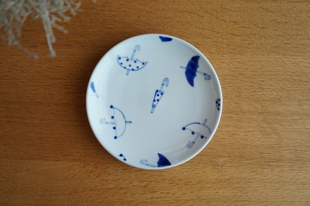 砥部焼窯元森陶房Kaoriさんの手描きの様々な傘がとてもかわいい5寸皿。