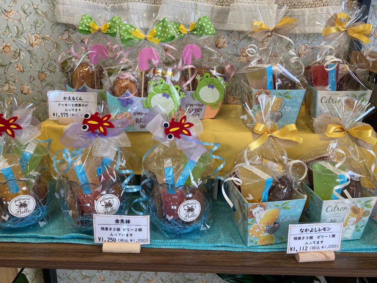 BOXやバケツ型、袋など、種類豊富なギフト用の洋菓子・ゼリーも並んでいます。