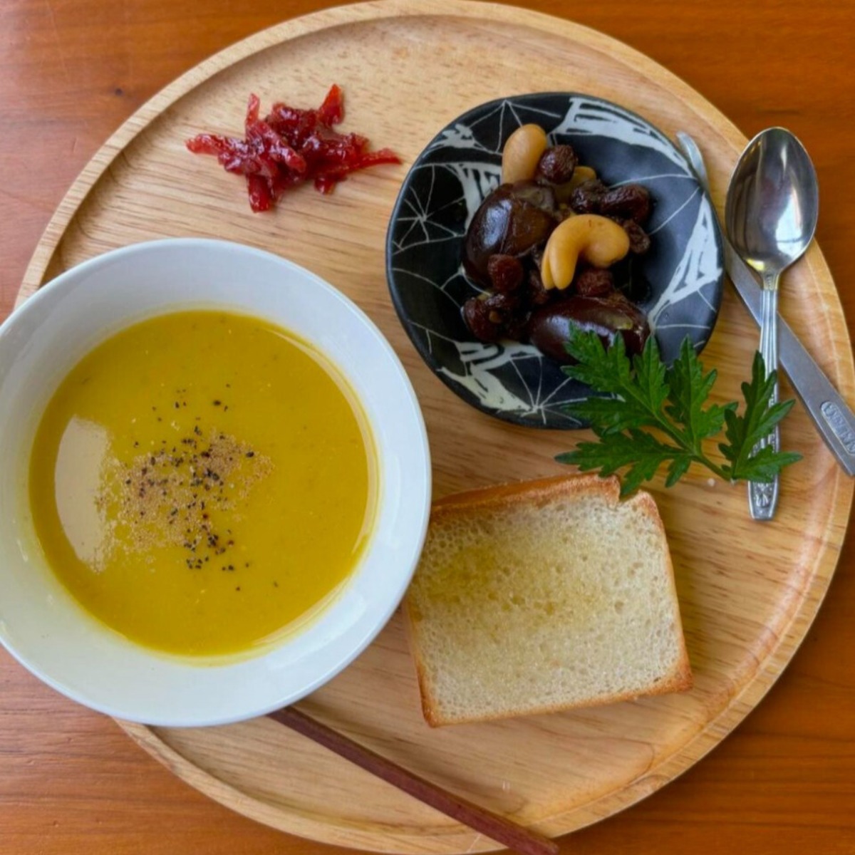 「食堂ヨラス」の自慢の一つはモーニングで提供される「お野菜のポタージュとお米のぱん」。