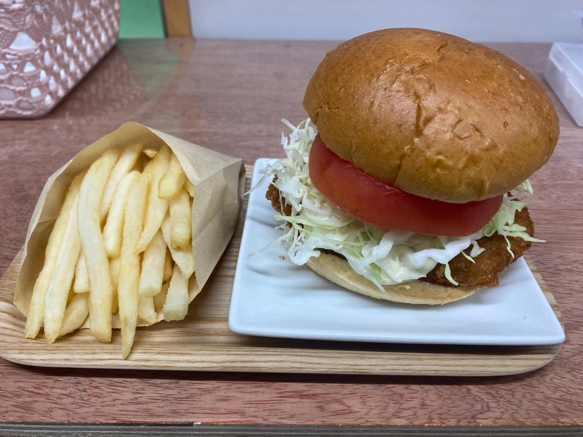 じゃこカツバーガーとポテトのセットは、地元の新鮮なじゃこを使った特製カツが特徴です。バーガーには、シャキシャキのキャベツとトマトにオリジナルソースが添えられていて、味のアクセントとして抜群の組み合わせです。