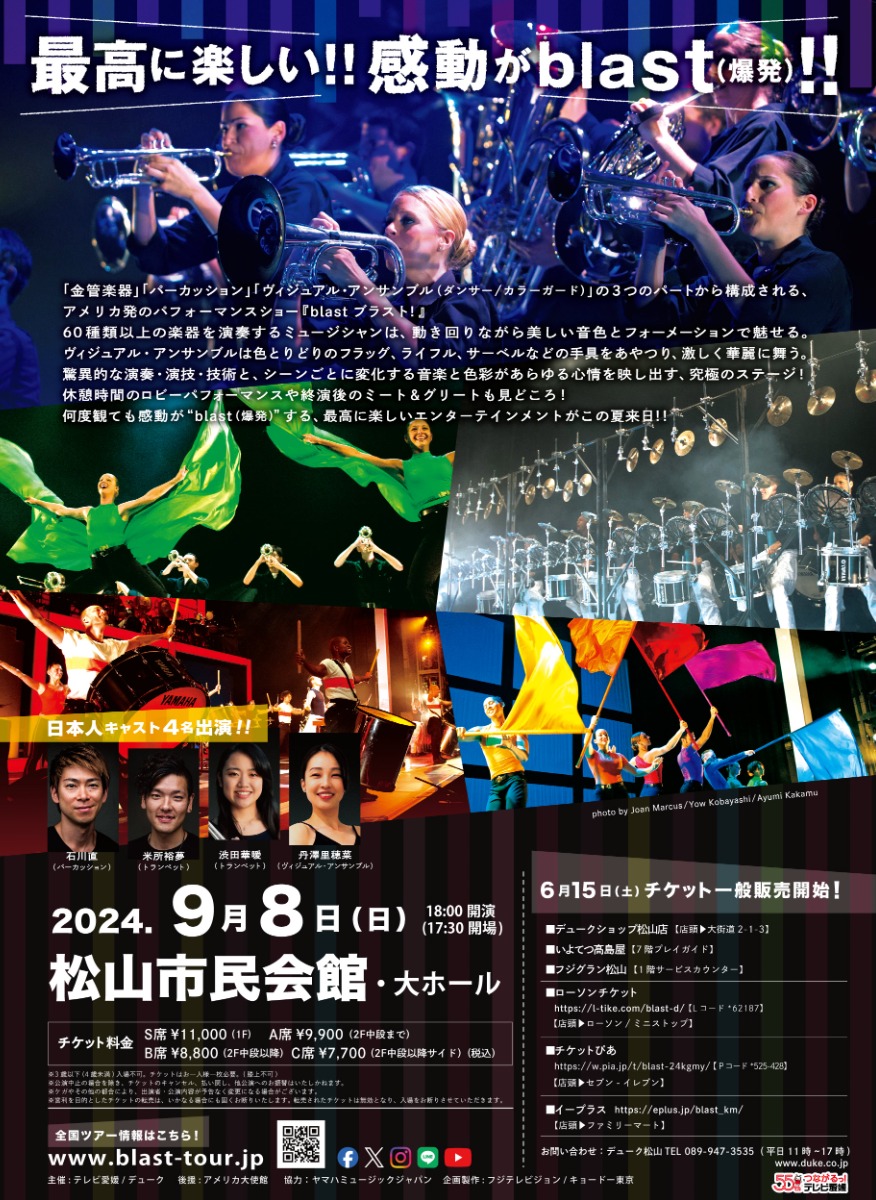 「金管楽器」「パーカッション」「ヴィジュアル・アンサンブル(ダンサー/カラーガード)」の3つのパートから構成される、アメリカ発のパフォーマンスショー「blast!(ブラスト)」が、9月8日(日)に松山市民会館に開催!公演を前に、出演キャスト・石川直さんを招いた合同インタビューが行われ、公演への想いを語っていただきました。その模様をお届けします。
