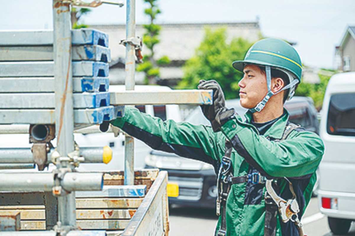 現在は資材の準備や運搬など、上部で作業を行う先輩たちを地上でサポートする業務を担っている。
