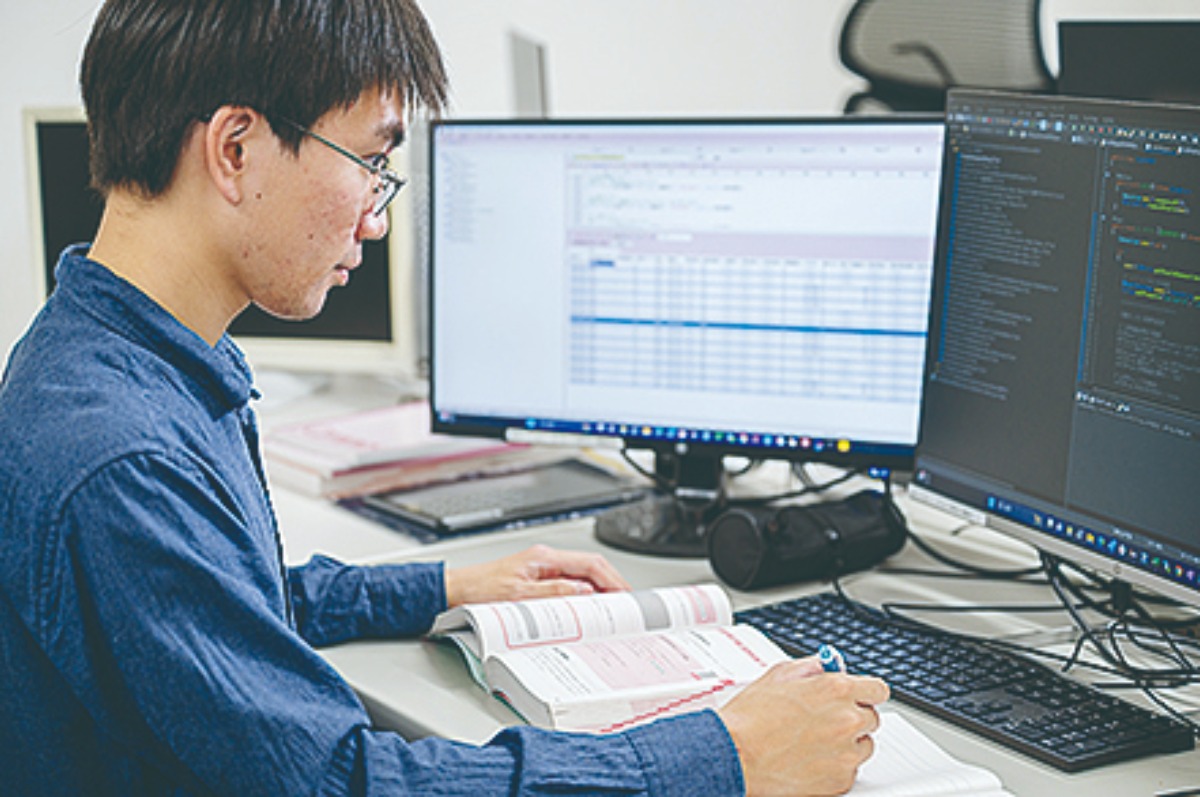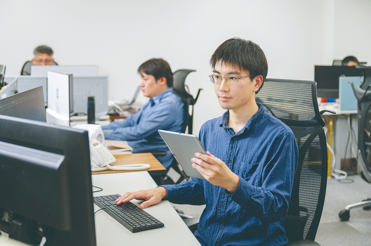 現在はケーブルテレビの申込管理システムの開発、改善に携わっている。コード設計やプログラミングなど、専門的な業務で覚えることも多く大変な日々ではあるが、「上司や先輩に質問をすると、直接的な回答だけでなく考え方を指示してくれるので、思考力が鍛えられます」と、真摯に努力を重ねる姿が頼もしい。
