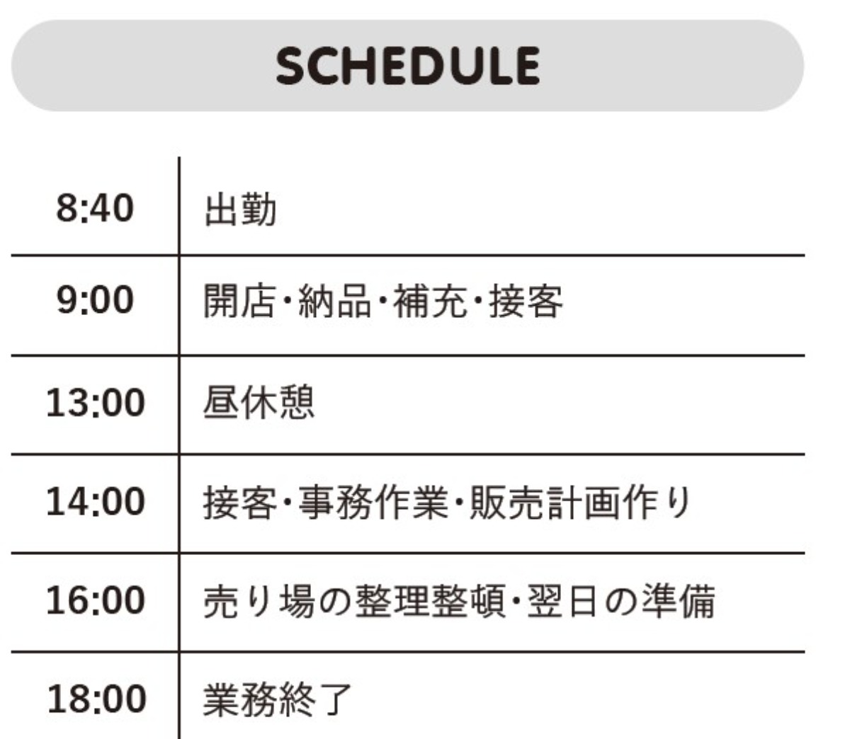 ●勤務時間/8:30~17:30、13:00~22:00(シフトは店舗によって異なる)