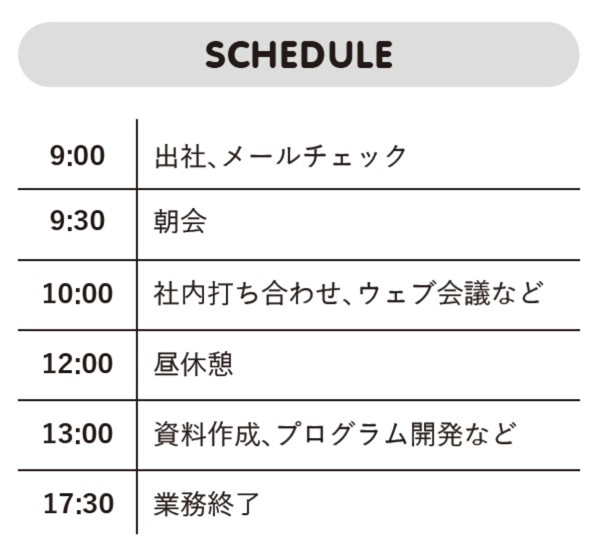●勤務時間/9:00~17:30 ※スーパーフレックスタイム制度あり