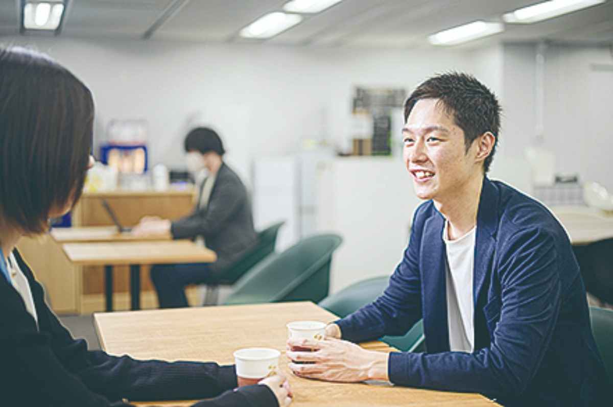 息抜きがてら、5階のカフェスペースに先輩や後輩を誘ってコーヒーブレイク。
