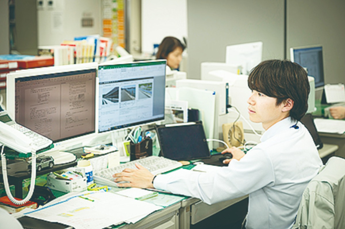 入社5年目の現在は、橋梁の補修設計に携わっている。数十年前に遡る建設当時の図面を紐解き、現状を調査したうえで補修プランを発注者へ提案。