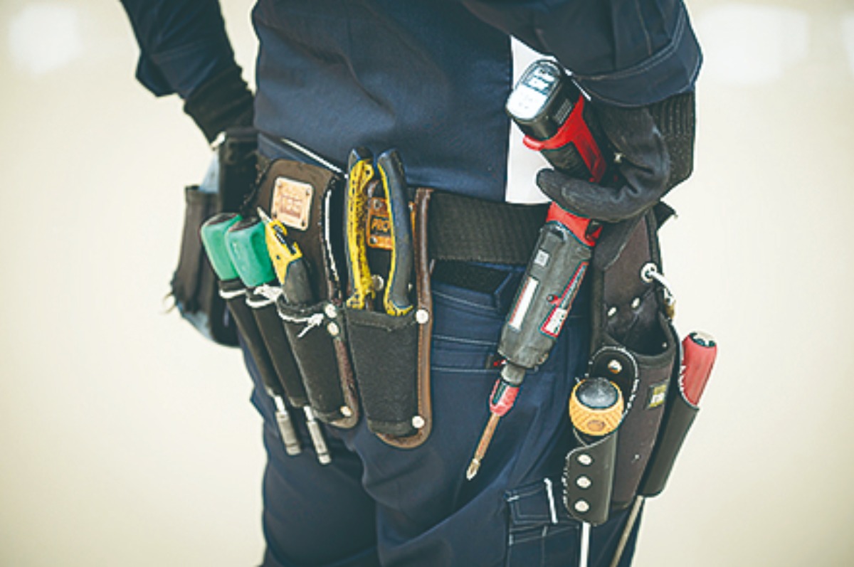 橋本さんは様々な現場に赴き、エアコンや自動ドアなどの点検や修理、取付工事などを行っている。