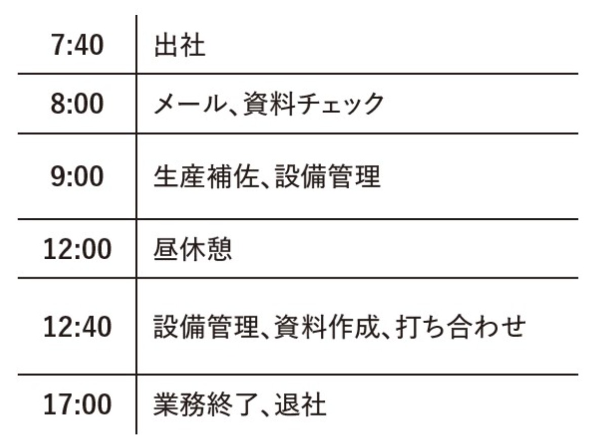 4年前からはエンジニアリング部のリーダーとして、機械のメンテナンスや故障したときの修理、新しく機械導入するときの予算管理を含む、管理業務全般を行いながら、約20人のメンバーが働く工場全体の作業管理リーダーも兼務している。