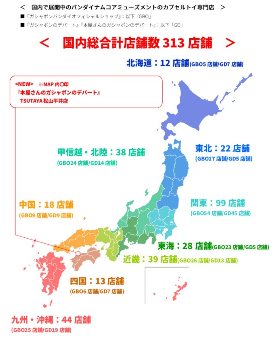 株式会社バンダイナムコアミューズメントは、全国に展開するカプセルトイ専門店『ガシャポンのデパート』を書店内に開設し、2024年6月28日(金)、「TSUTAYA松山平井店」(愛媛県松山市)内に『本屋さんのガシャポンのデパート』としてオープンします。