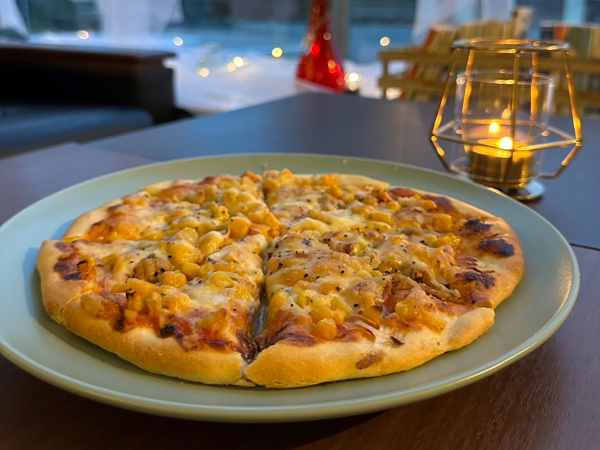 手作り生地の「ツナコーンピザ」と冷えたビールの絶妙な組み合わせ