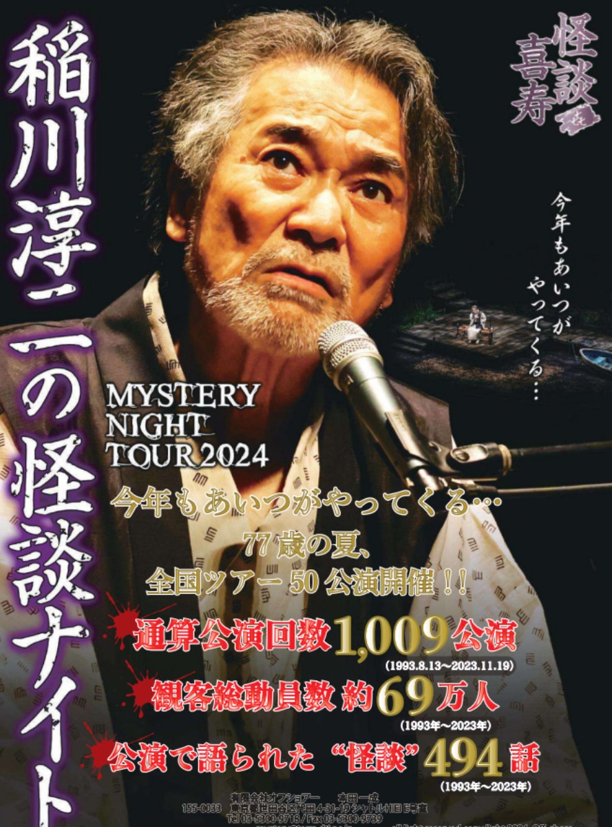 今年で77歳を迎える稲川淳二さんの全国ツアー『稲川淳二の怪談ナイト』が今年も開催! 7月中旬から始まる50公演ツアーを控え、通算公演回数1000公演を超える稲川淳二さんに、公演への想いや意気込みを合同インタビューで語っていただきました。怪談の語り部として長年活躍している稲川さんが、今年のツアーで届ける恐怖と感動の物語、その魅力に迫ります。