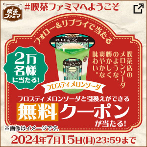 ファミリーマートの公式Xアカウントをフォローし、指定のハッシュタグをつけてリプライの上、特設サイトにてご応募いただくと抽選で2万名さまに「フロスティメロンソーダ」の無料引き換えクーポンが当たる!