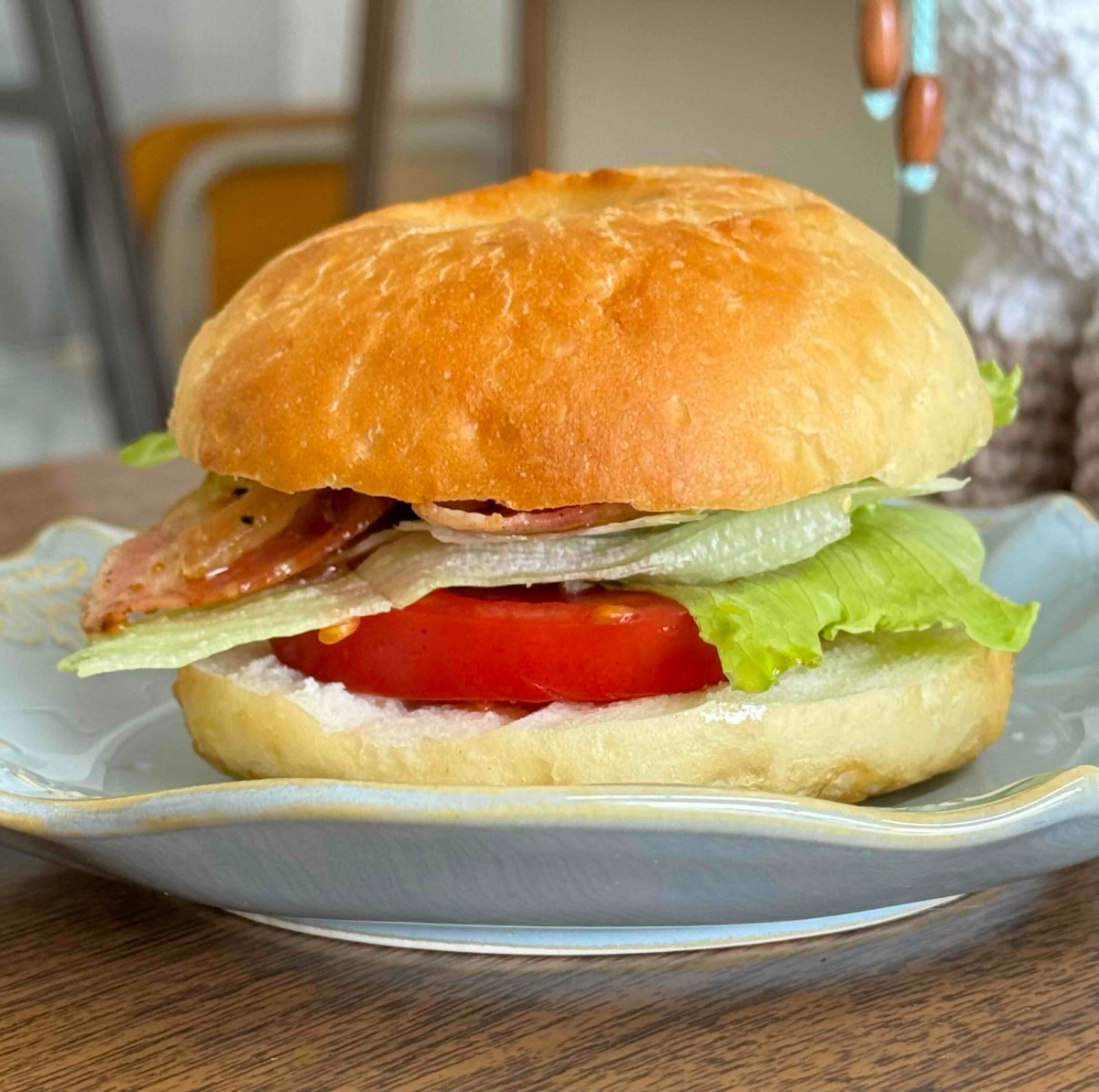 プレーンベーグルにクリームチーズをたっぷり塗り、ベーコンと愛媛のトマト、レタス、玉ねぎをサンドしています。