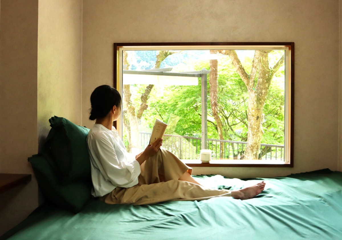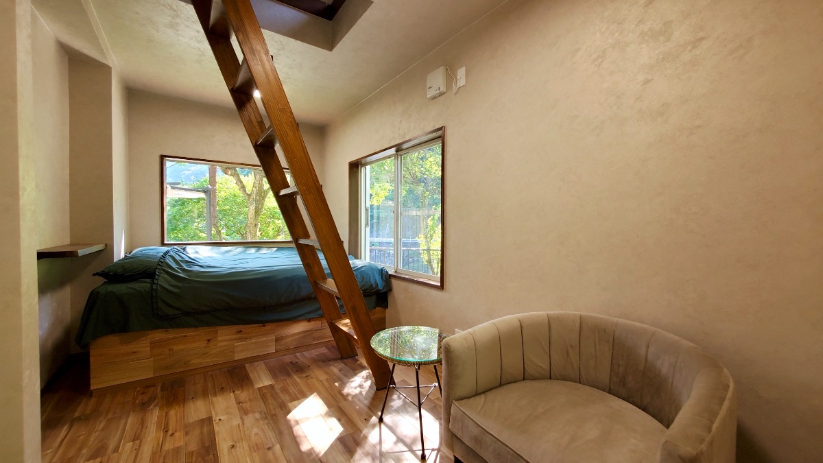 ベッドからも緑や川を眺めることができます。3名以上の場合はソファベッドやマットレスを利用してくださいね。