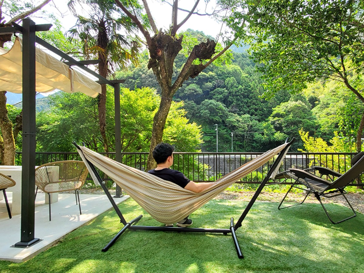 緑に囲まれた庭にはパーゴラやハンモックがあり、BBQや読書が楽しめる他、庭の横にある階段から川原へと下りれば、まるでプライベートリバーのように川遊びも楽しめますよ。