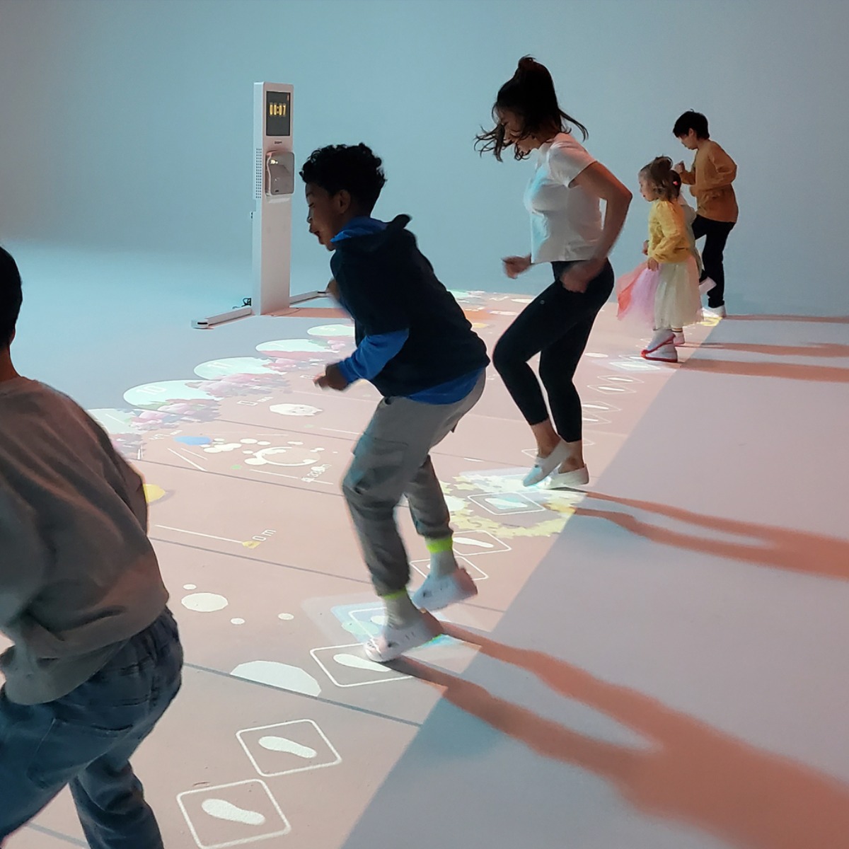 床に投影された映像に、手足を出すことでセンサーが反応し、フィットネスやミニーゲームが体験できます。子どもからお年寄りまで気軽に利用でき体を動かすことができますよ。自宅で座ってゲームをするよりも、運動しながらゲームができるのでおすすめです。