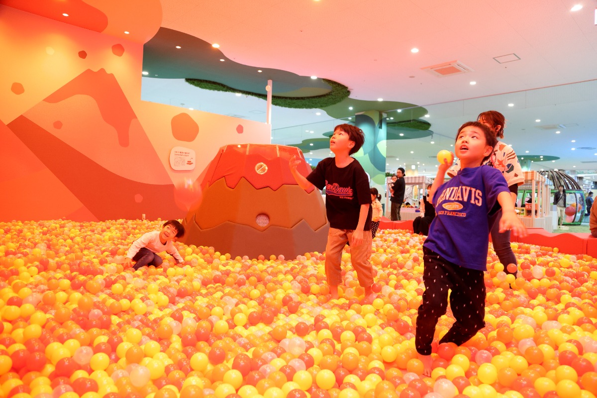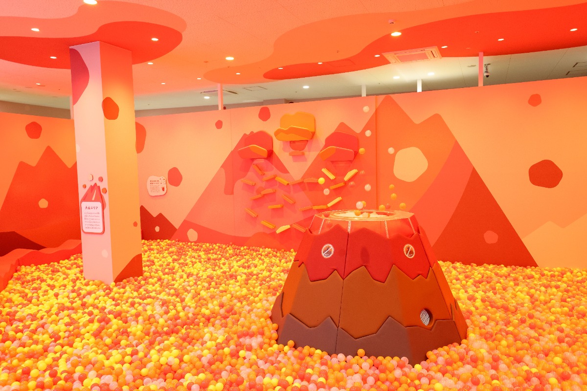ボールが飛び出す火山や、玉入れができる遊具があるボールプールが広がります。