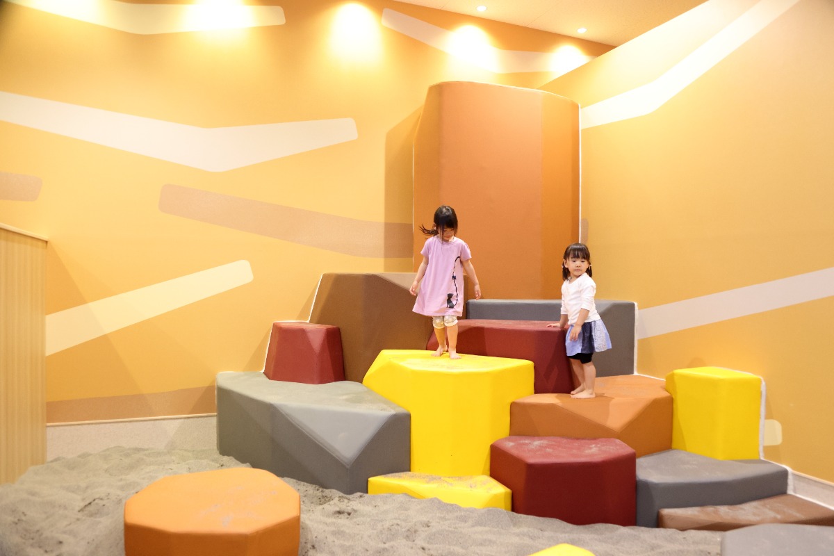 屋内でも地面とふれあうように創造的な砂あそびができる砂場は安心の抗菌砂を採用しているそう。