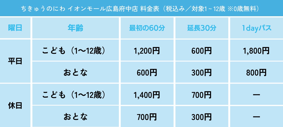 ※ちきゅうのにわが定めるスクールホリデー期間(夏休み、春休みなど)は休日料金。スクールホリデー期間は1dayパスはご利用不可
