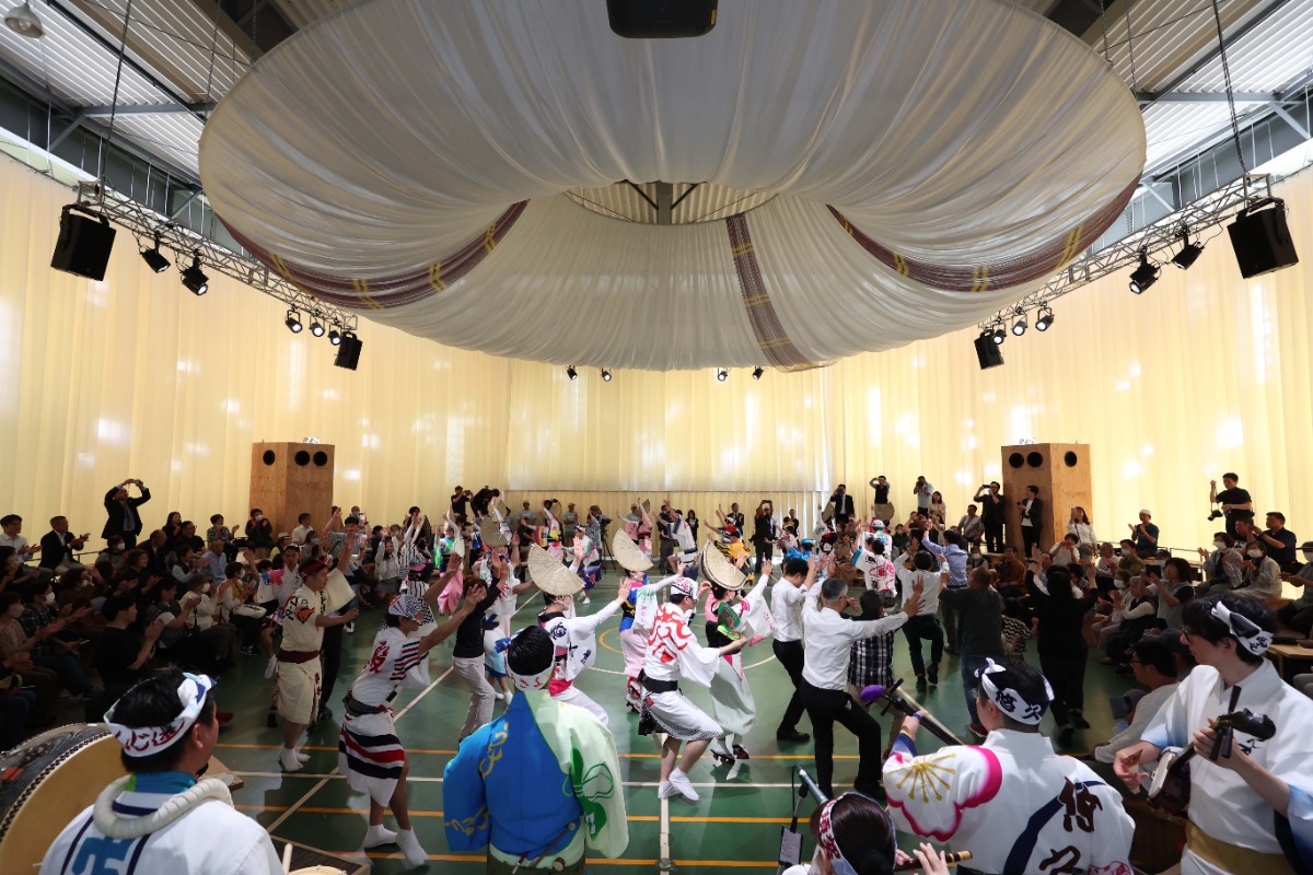 体育館をリノベーションしたオリジナルの円形ステージで、観客と有名連の踊り子が一体となり、ここでしか味わえない演出を体験!