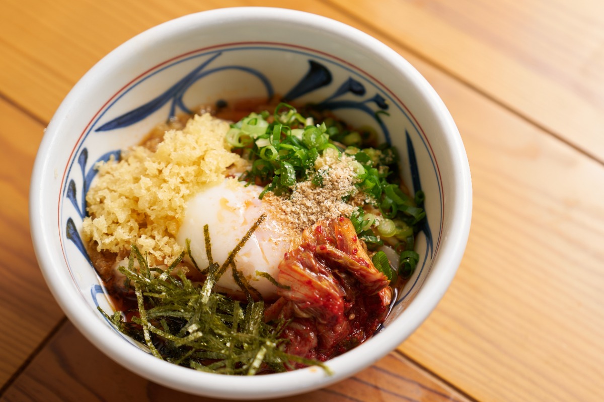 辛さ控えめのキムチとピリ辛の特製ダレに、温泉卵を絡ませると旨辛風味が広がります。