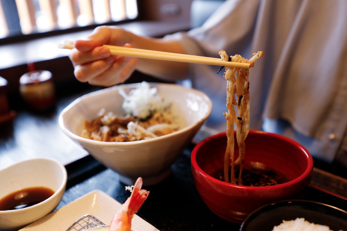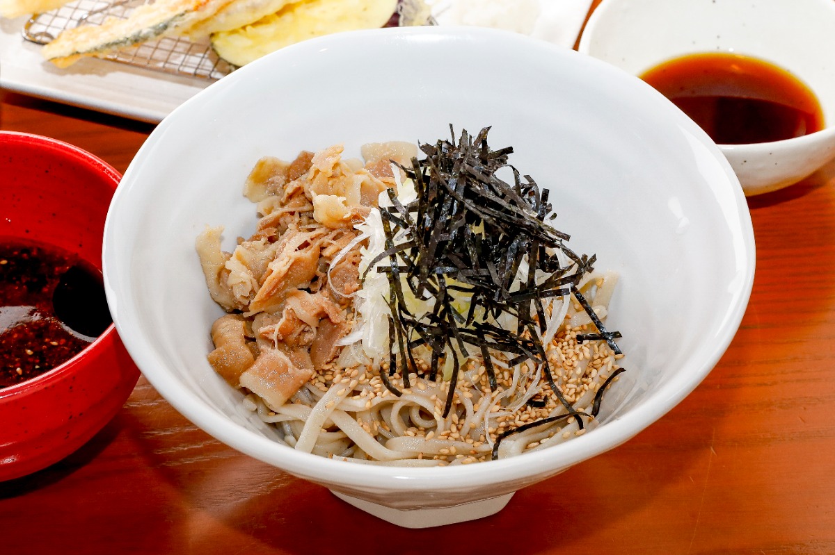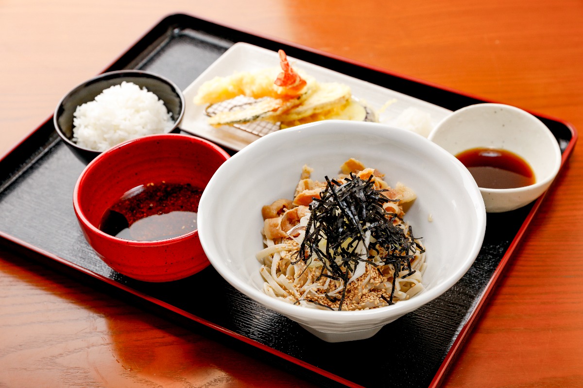 ピリ辛のつけダレと一緒にいただくとマイルドになり、“味変できるそば”として楽しめます!