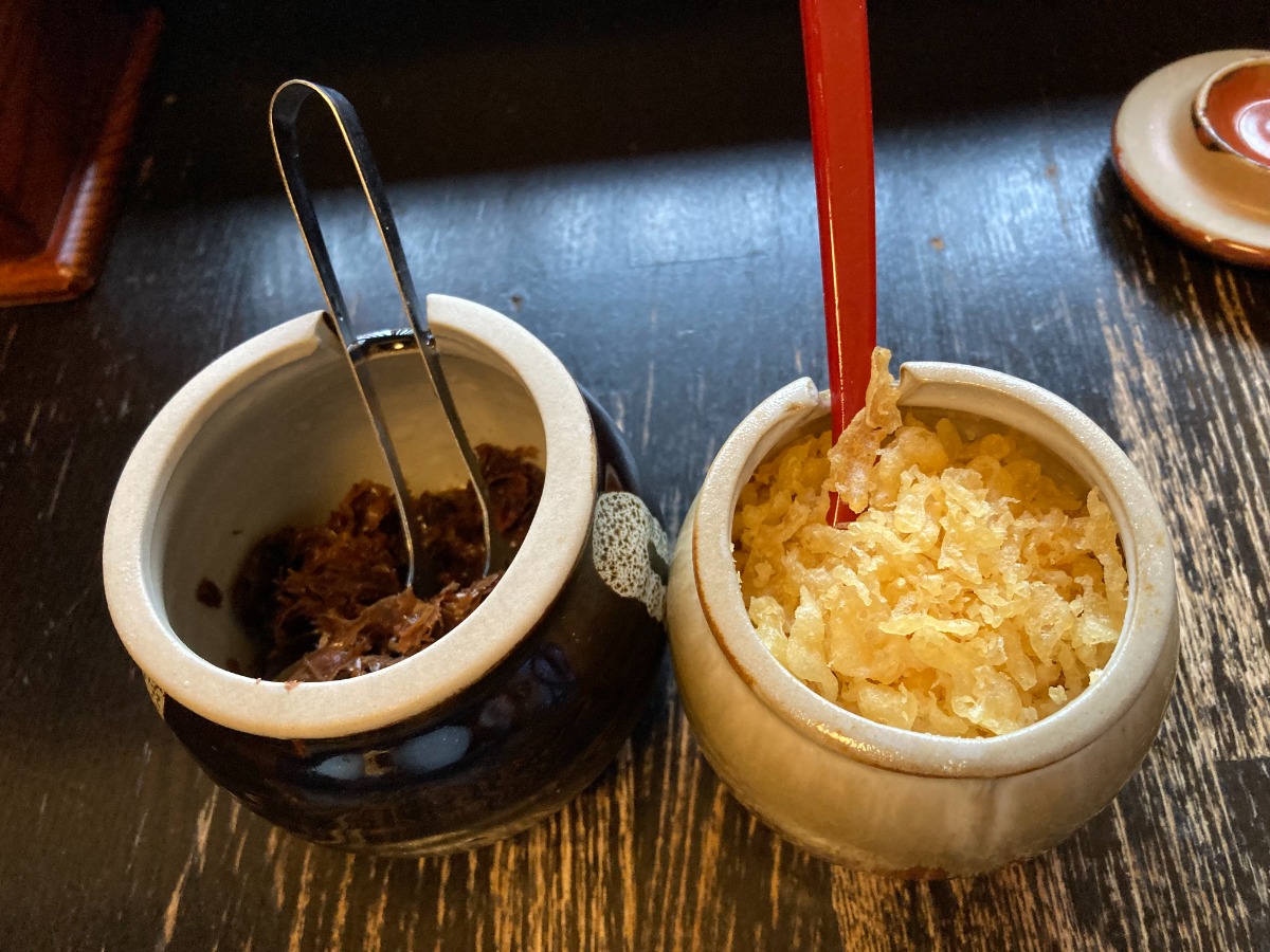 各卓上には、そばダシに漬け込んだ鰹節と天かすがあります。