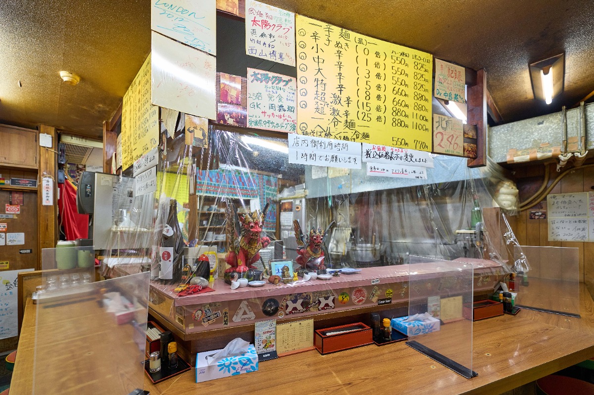 木目調の壁やカウンターが特徴で、温かみのある昭和レトロな雰囲気が感じられる「辛麺屋 桝元 松山店」。