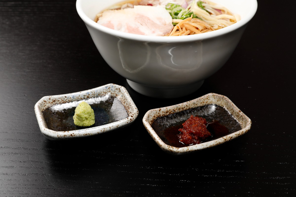 この「辛」は自家製のトッピングで、どちらもスープに少量加えるだけで異なる風味を楽しめます!