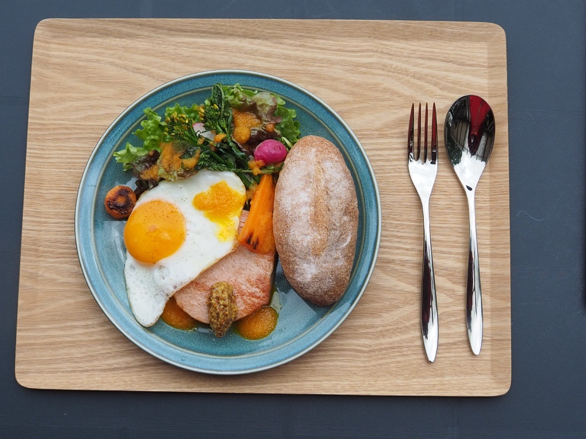 写真の「内子豚フライシュケーゼと自社栽培の米粉パン目玉焼きのせ(ドリンクセット)」など、素材の味を最大限に引き出した料理が自慢です。