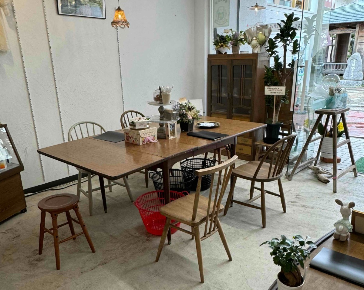 店内はコンクリート調のスタイリッシュな空間にアンティークなテーブルや椅子が。居心地の良い雰囲気を演出しています。