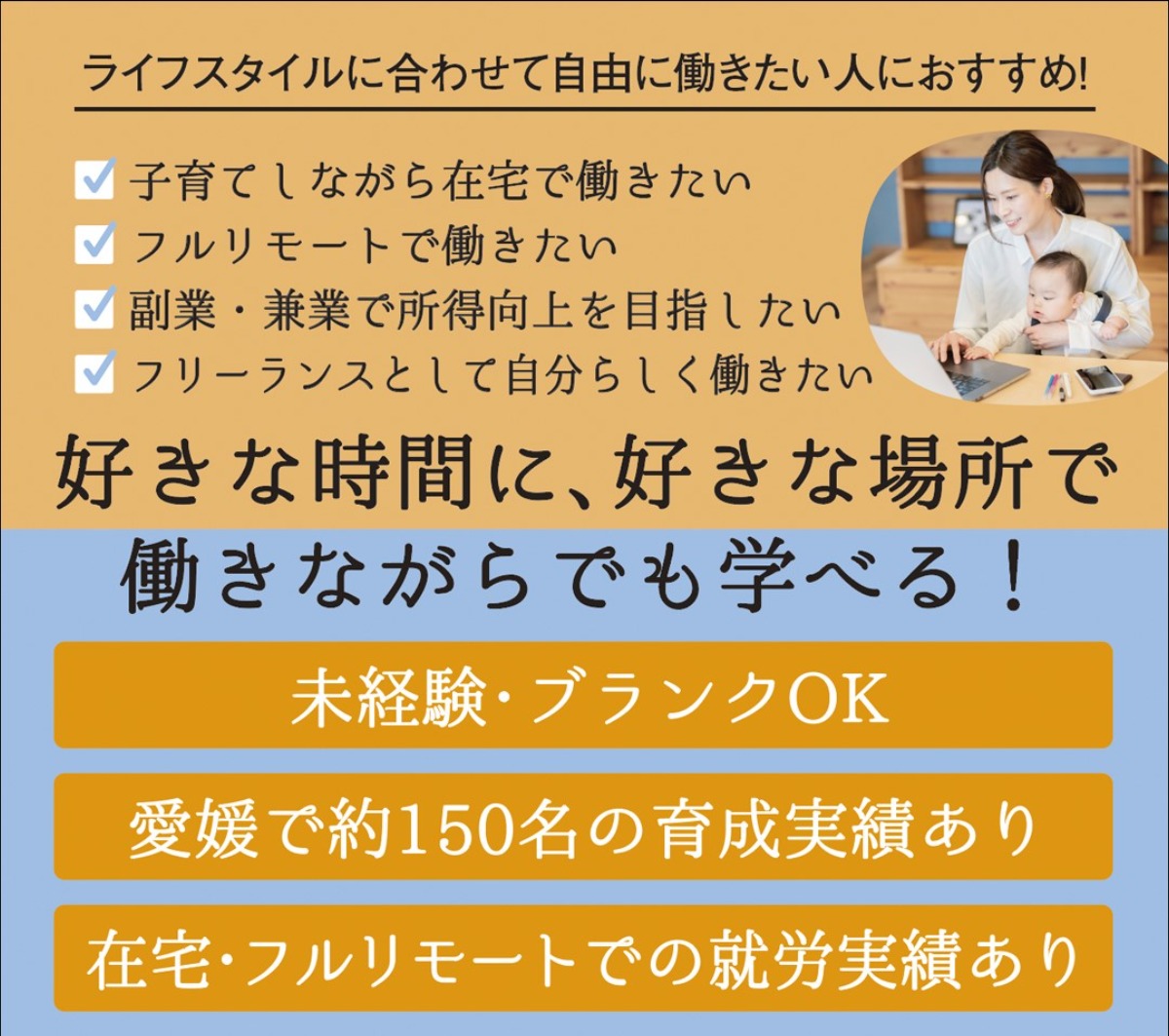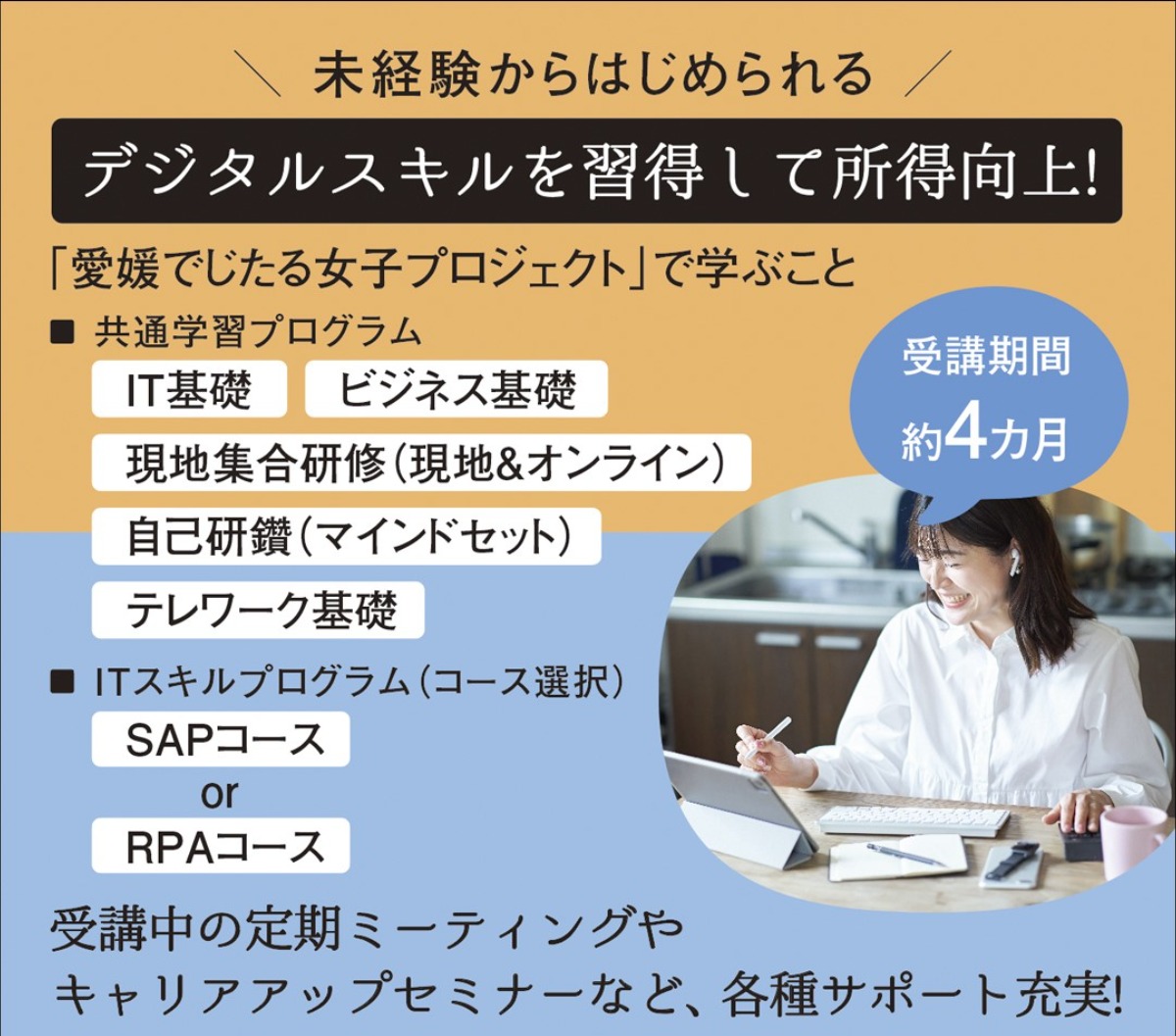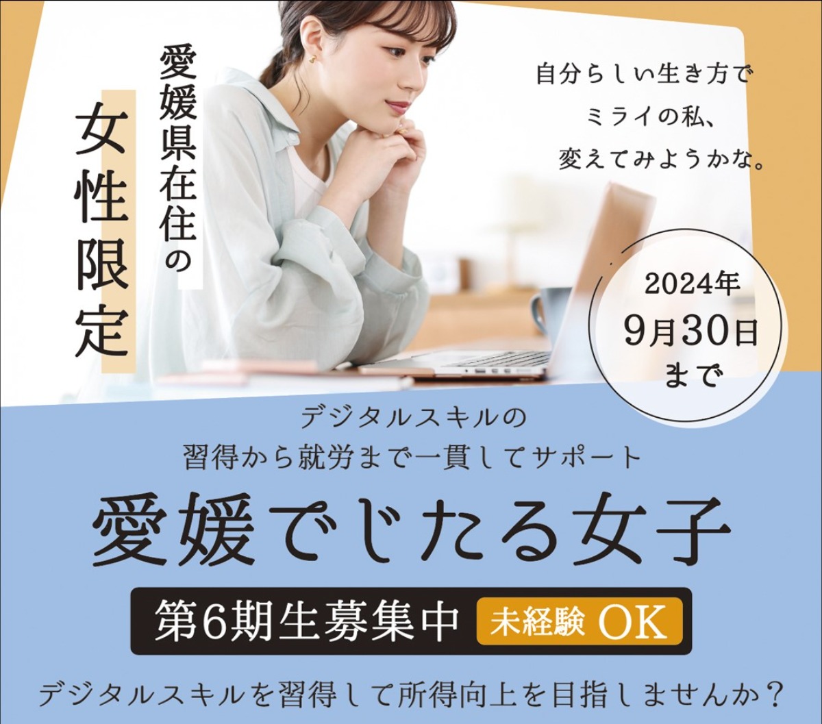 応募条件:愛媛県在住の成人女性(18歳以上)(単なるスキル習得ではなく「稼ぐこと=就労すること」を目指している女性)