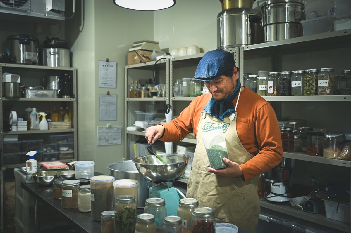 後藤さんのラボには、数十種類に及ぶスパイスが常備、味のバランスをみながら足し引き調合していき絶妙の配合に調合していきます。