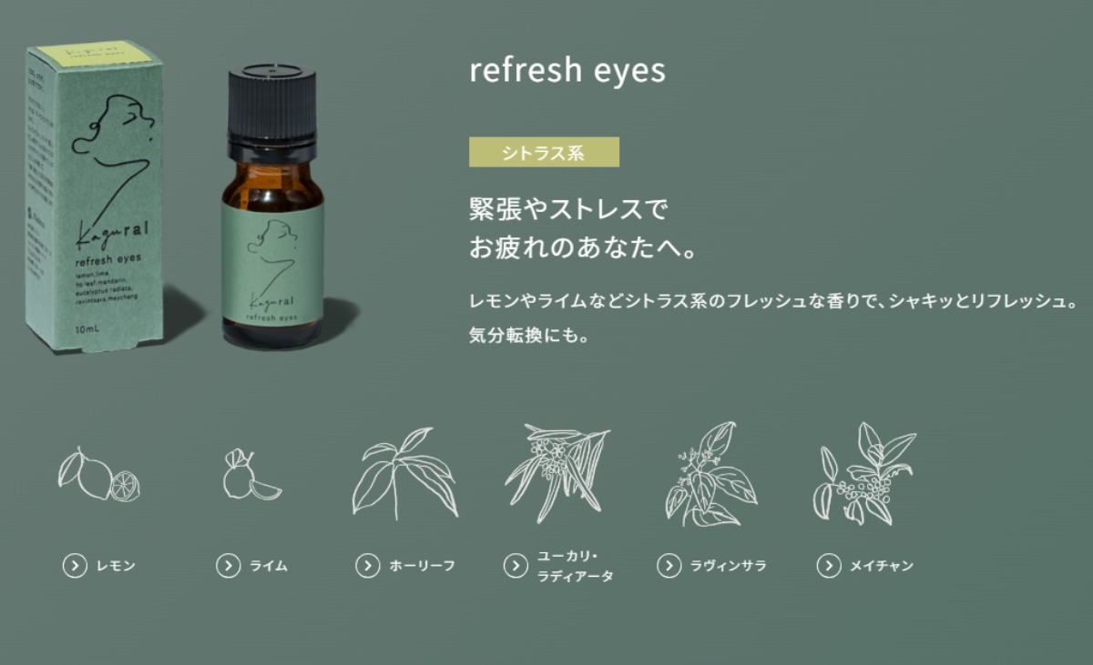コンタクトレンズ販売店「Menicon Miru」がオリジナルブレンドアロマ「Kagural(カグラル)」の販売をスタート。なんだかだるい。ぼんやり重いなど、忙しい毎日でちょっと乱れたココロとカラダにアロマの香りでバランスを