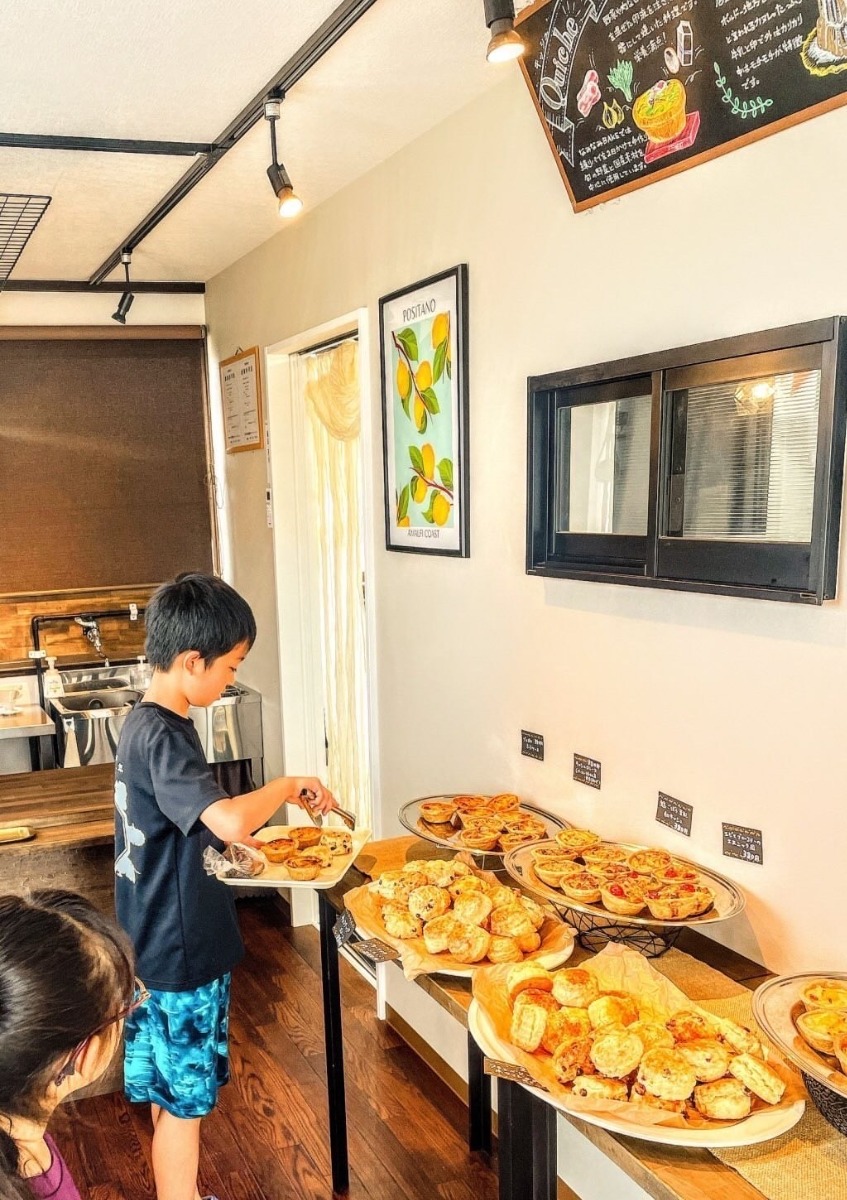 プレハブの外観からは想像できないほど、店内は匠の技で丁寧に改装されていて、まるで隠れ家のような雰囲気。階段を上がると、2階の店内にはキッシュ・スコーン・カヌレがずらりと並び、まるで宝探しをするようなわくわく感が広がります。