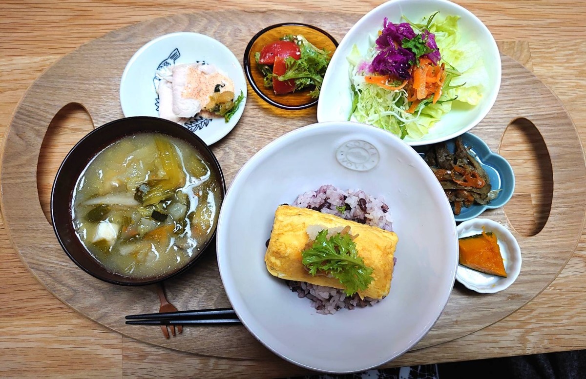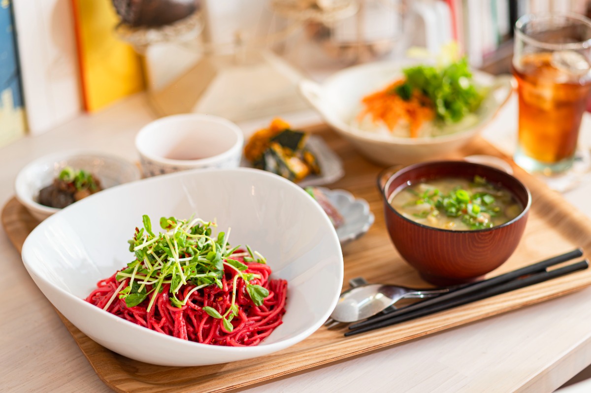 メインにおばんざい、具だくさん豚汁、サラダ、ドリンク付き。この日のメインはビーツのパスタ。できる限り地元の食材を使い、ソースも手作りしているそうです。