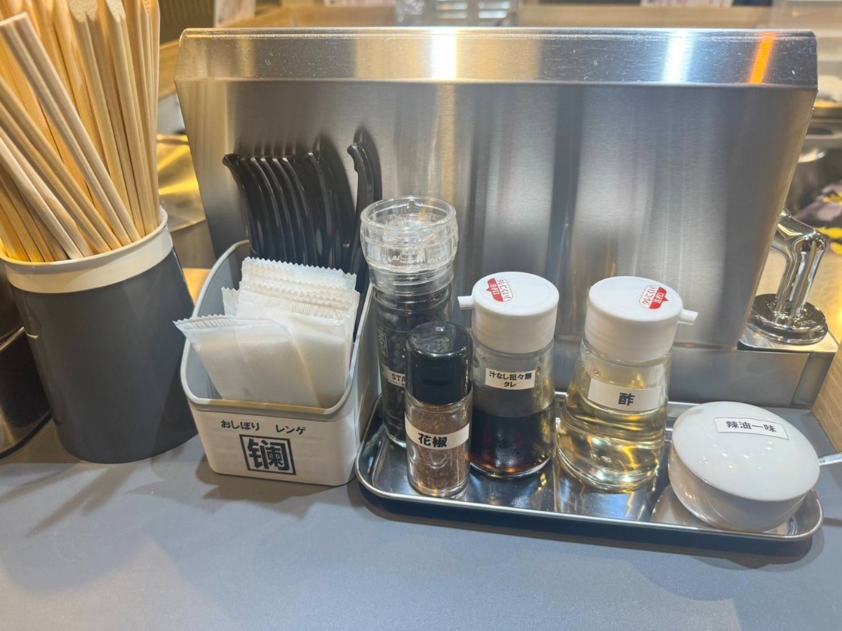 卓上には、担々麺のタレや自家製の辣油一味・酢・花椒が用意されていて、好みに応じて味をカスタマイズ可能。