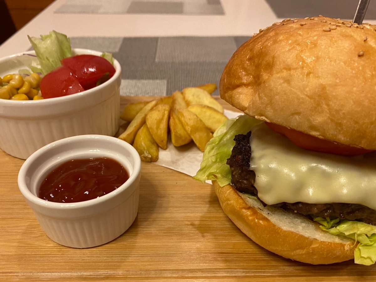 特にもちっとした食感が特徴のバンズと、国産ビーフ100%のパティが使われたハンバーガーは、ジューシーな味わい。