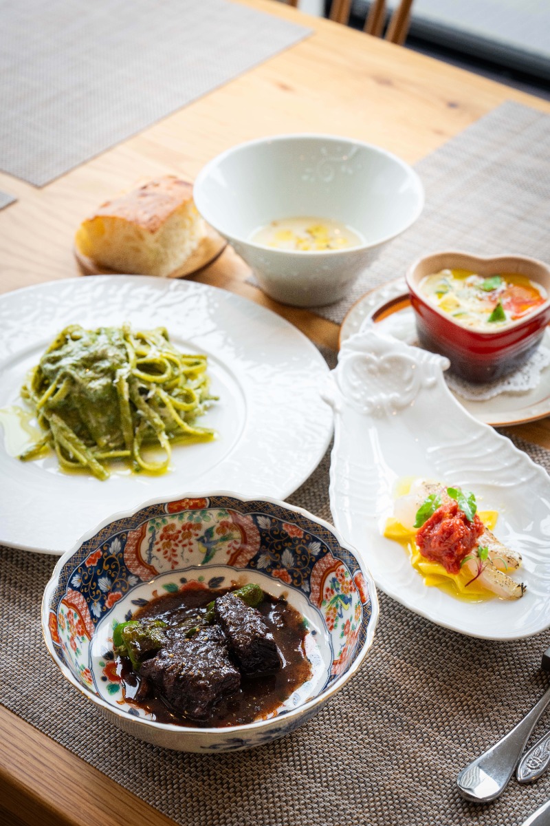 おすすめは、土・日曜限定のランチコース。この日は、メイン「和牛ランプ肉の赤ワイン煮込み」の他、アミューズ、前菜、スープ、自家製パン、パスタのコースです。日によって内容が変わります。コース内容は、アレンジも可能なので予約時に相談してみてください。