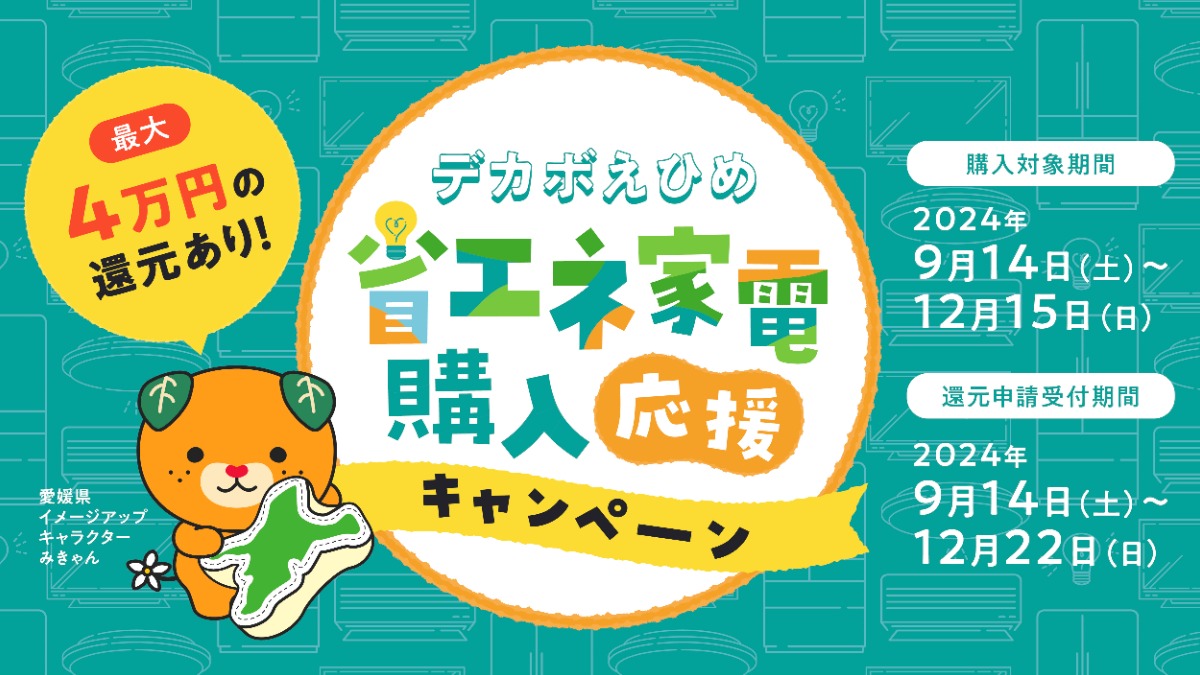 現在、「デカボえひめプロジェクト」の一環で、省エネ性能の高い家電製品の購入を支援するキャンペーンがはじまりました!