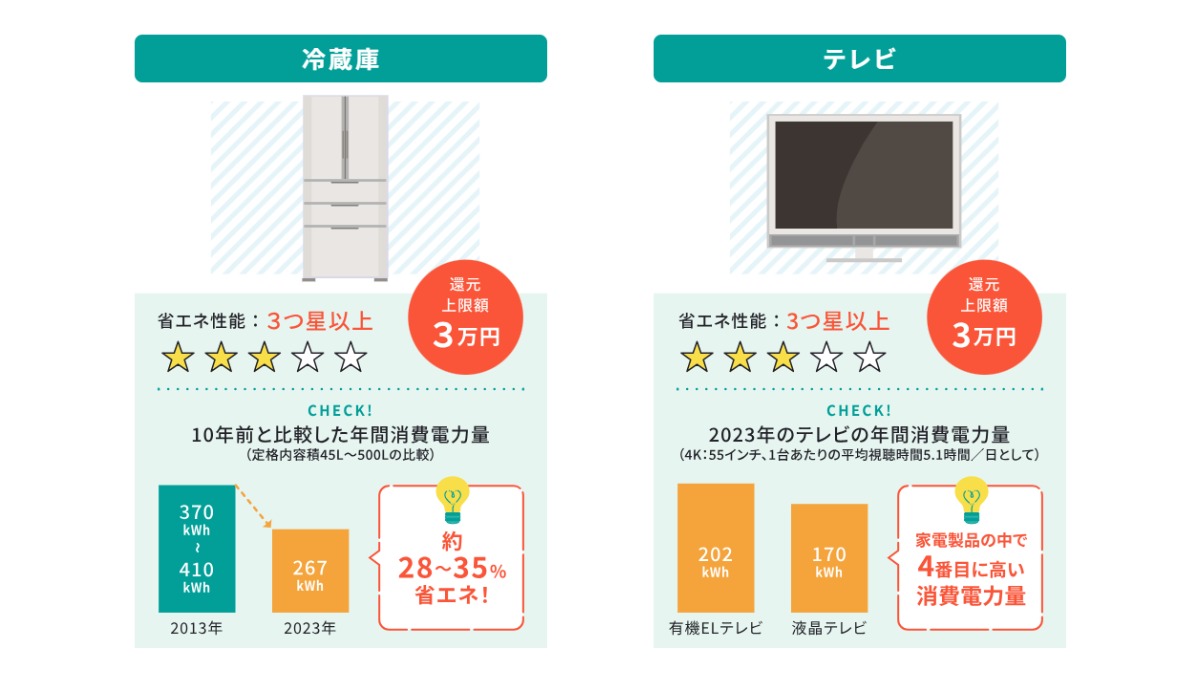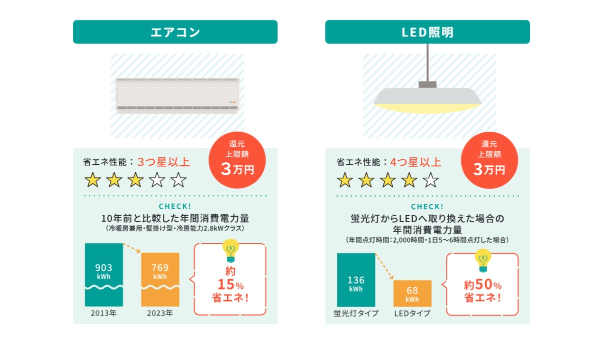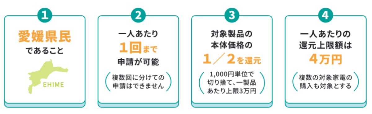 期間中に対象店舗で、省エネ基準を満たすエアコン、LED照明、冷蔵庫、テレビを購入した愛媛県民に対し、購入額に応じて、スーパーや百貨店で利用できる商品券を1人最大4万円分を還元する内容です。