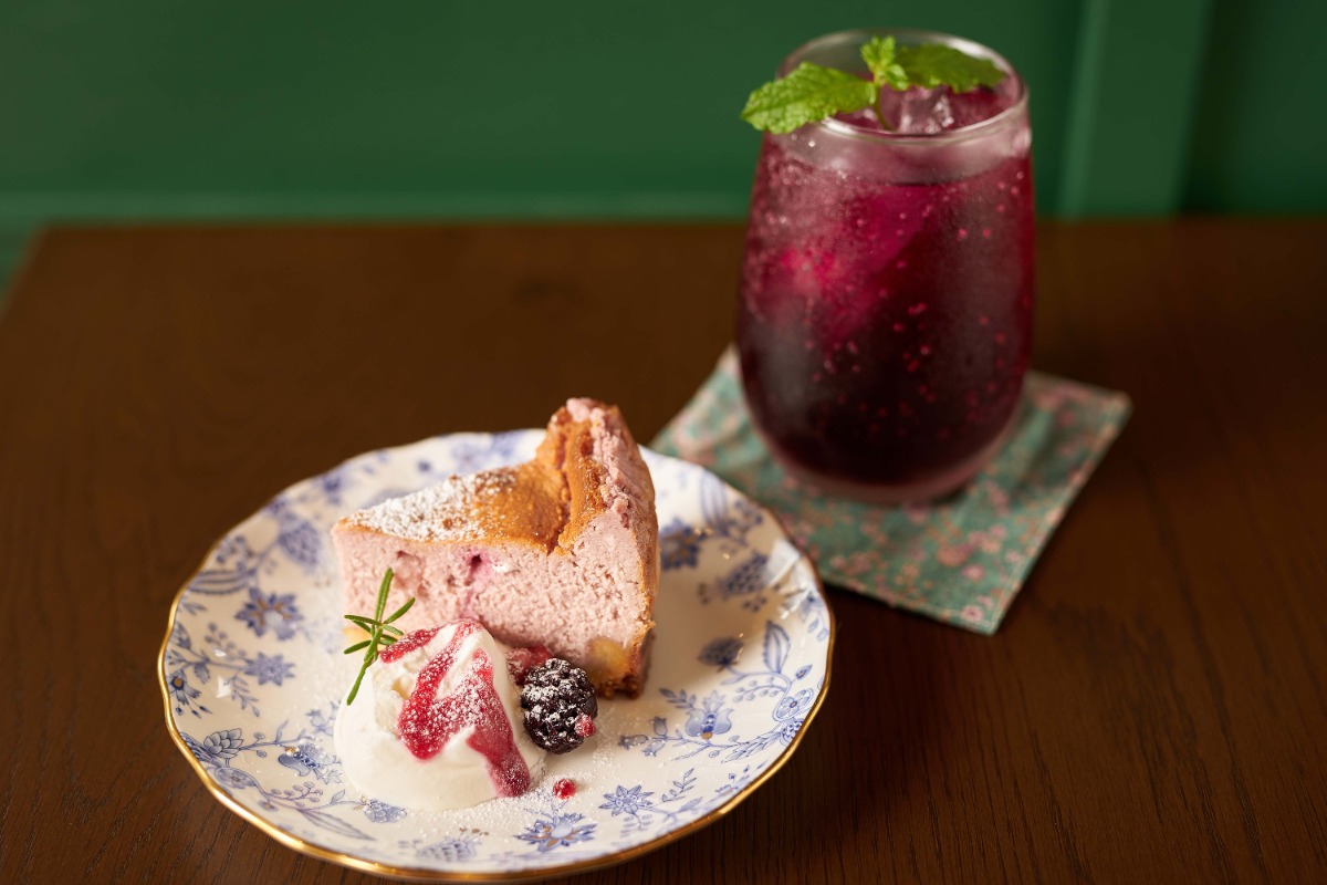 デザートの「ラズベリーのチーズケーキ」と「しそサイダー」。食後に追加で注文してみてください!